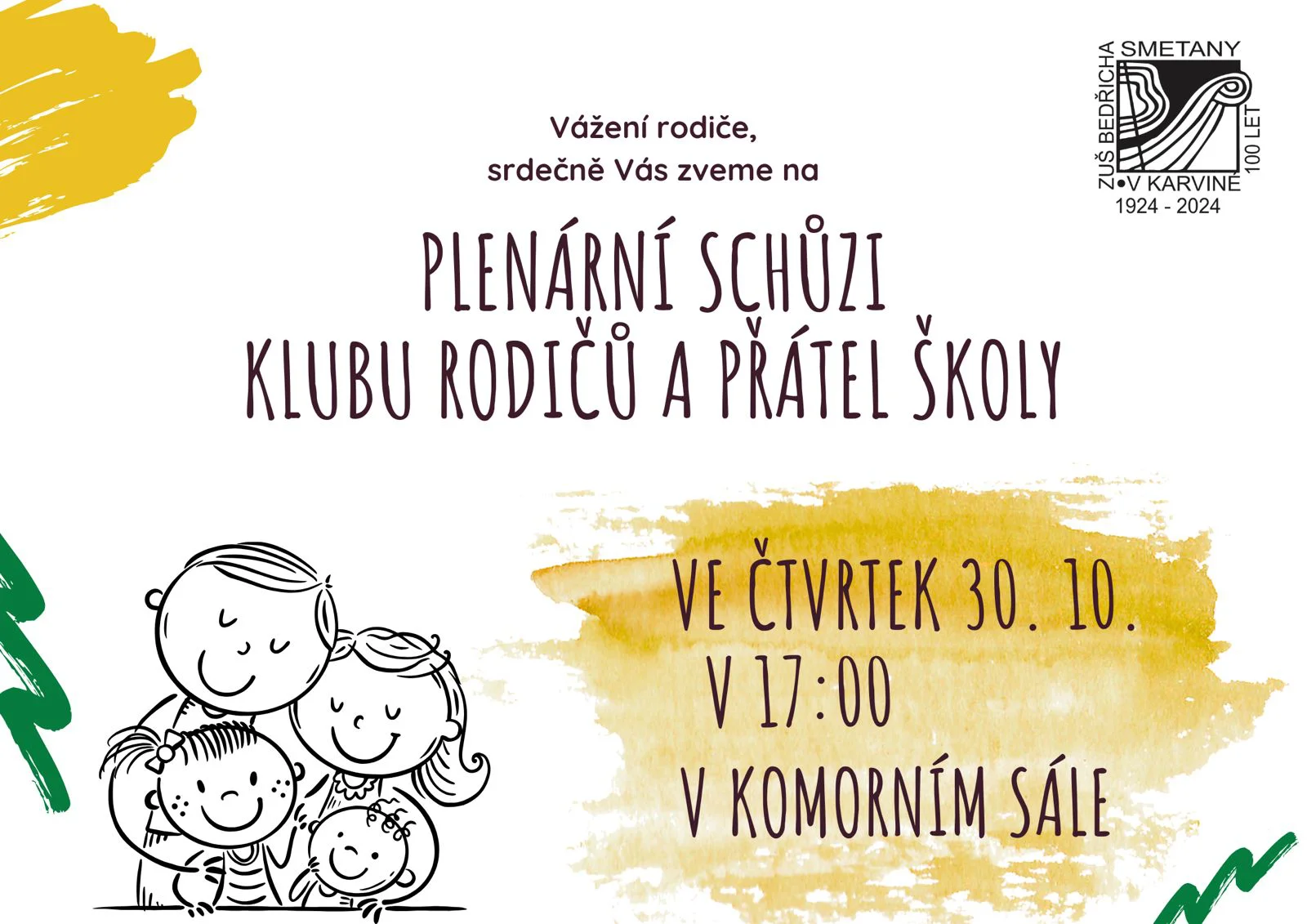 srdečně Vás zveme na Plenární schůzi Klubu rodičů a přátel ZUŠ, spolku, která se uskuteční ve čtvrtek 30. října 2025 v 17 hodin v Komorním sále ZUŠ.