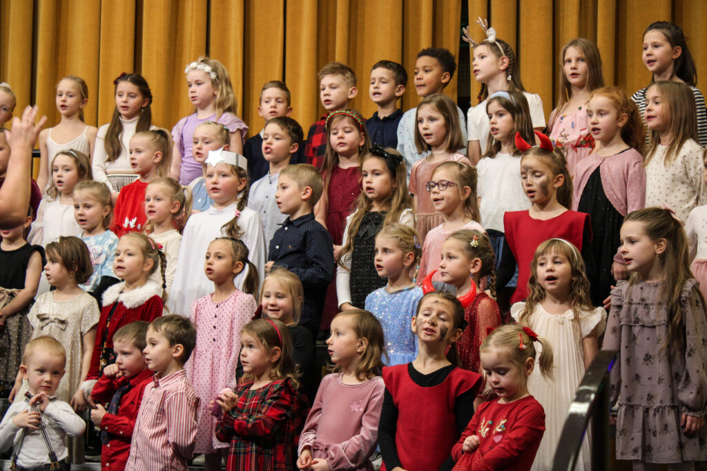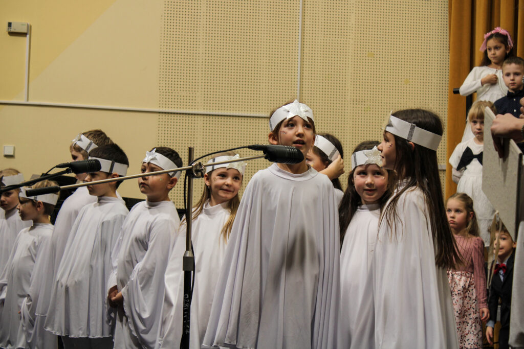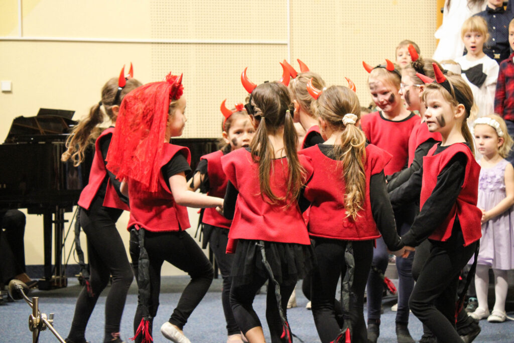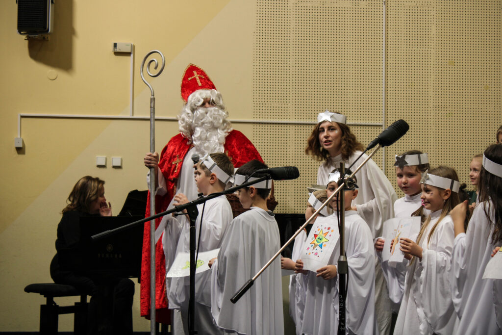 Zpěváčci ze sboru Perníček a Permoníček mladší spolu s dětmi z přípravné hudební výchovy rozezněli sál krásnými vánočními melodiemi a koledami. Vedle nich se na pódiu představily také malé baletky z tanečního oboru, ať už jako vločky či nezbedné čertice, a celým koncertem provázeli nejmladší dramaťáci v rolích andílků připravujících se na první mikulášskou nadílku. Na závěr koncertu je také navštívil sám Mikuláš, který vystupujícím dětem přinesl za odměnu perníčky.